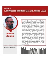 L'autore: Antonio Zunno (Spinazzola 1973) si laurea in architettura presso l’Università degli Studi di Firenze nel 1998. Nello stesso anno vince il concorso di ammissione alla Scuola di Specializzazione in Restauro dei Monumenti dell’Università degli studi di Genova presso la quale consegue il diploma nel 2001. Dal 1998 è libero professionista a Lecce e si occupa prevalentemente di interventi di restauro. Dal 2012 è funzionario architetto di ruolo nel Ministero per i beni e le attività culturali e per il turismo con primo incarico presso la Direzione Regionale in Emilia Romagna in occasione del sisma. Dal 2015 invece è in organico presso la Soprintendenza archeologia belle arti e paesaggio per le province di Brindisi Lecce e Taranto, dove si occupa di una sezione territoriale e per la quale segue, con diversi profili di competenza, alcuni cantieri di restauro in Salento e nel resto della Puglia.