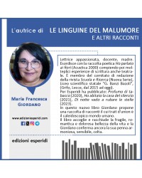L’autrice: Lettrice appassionata, docente, madre. Esordisce con la raccolta poetica Ho parlato ai fiori (Acustica ed., 2000). Le sue esperienze di scrittura hanno anche prodotto: Vita in simbiosi. “Con te partirò” vorrei cantare in AA. VV., Antologia di racconti, in Codice Umano, a cura di P. Baloppi (Cantera ed., Roma 2022), Un segmento di lettura didattica, sfogliando le pagine dell'Eneide, in Quando Ippocrate corteggia la musa. A Rocco De Vitis medico umanista, a cura di F. De Paola e M. A. Bondanese, n. 31 della collana “Quaderni de’ L'idomeneo”, Società di Storia Patria - sezione di Lecce, (Grifo ed., Lecce 2017). Menzione di merito al XXI Concorso di poesia inedita, Tra un fiore colto e l'alto donato (con pubblicazione nell'antologia AA. VV. Un fiore colto e l'altro donato, Poesie d'amore 2025, Rosa Aletti ed., Villanova di Guidonia 2025). Ha composto testi teatrali per il Reading I miti oggi, Riscrittura dei miti (a cura di A. R. D’Auria, Cantiere Testaccio, Via Bodoni, Roma, 30 maggio 2025). È membro del comitato di redazione della rivista Scuola e Ricerca (Nuova Serie), Liceo scientifico statale “G. Banzi Bazoli”, Grifo ed., Lecce, dal 2015 ad oggi). Per Esperi ed. ha pubblicato: Profumo di tabacco (2020), Ho abitato la casa del silenzio (2021), Di notte vado a rubare le stelle (2023).